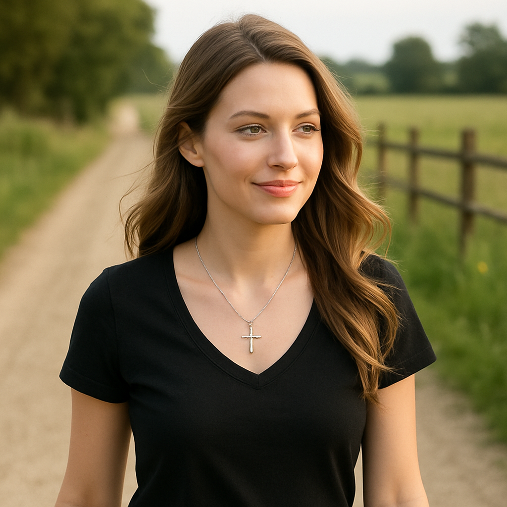 A ladies sterling silver cross necklace offers the perfect blend of grace and symbolism. Crafted from high-quality pure silver cross necklace materials, these necklaces are both beautiful and long-lasting. The cool sheen of a silver cross chain paired with an elegant cross pendant complements any outfit, from casual wear to evening attire.