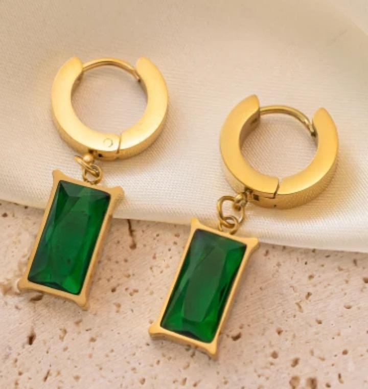 Stylish earrings featuring synthetic emerald-cut green crystals set on 18K gold-plated stainless steel hoops. Hypoallergenic, lightweight, and perfect for daily wear or evening occasions. Diameter ~15mm, dangle ~10x6mm. Comes as a pair in a deluxe gift box.