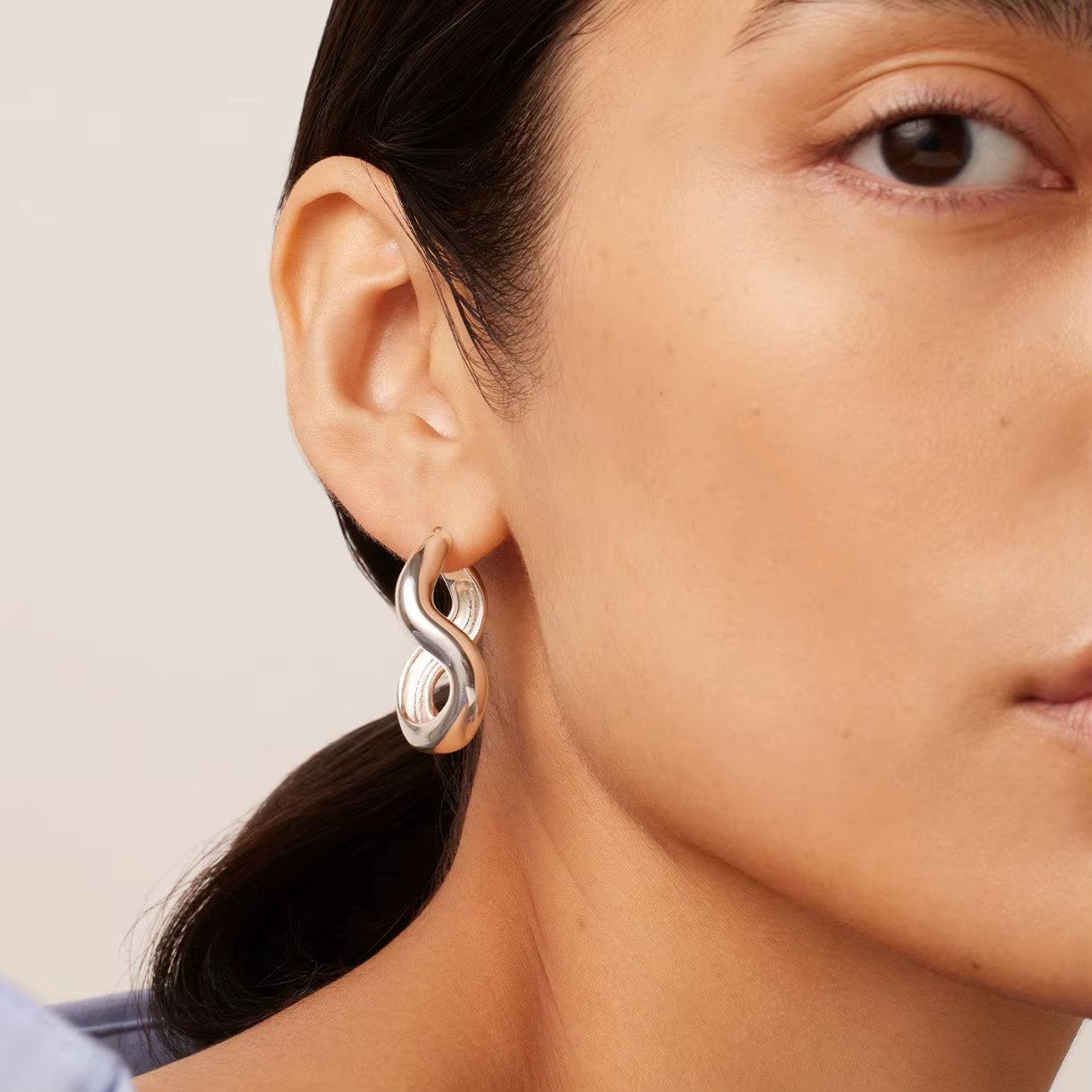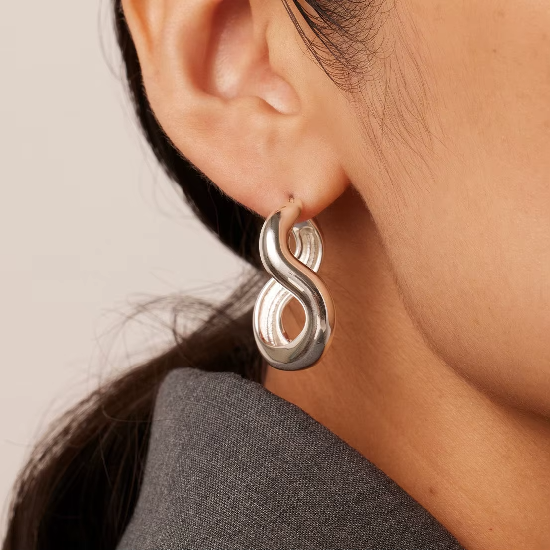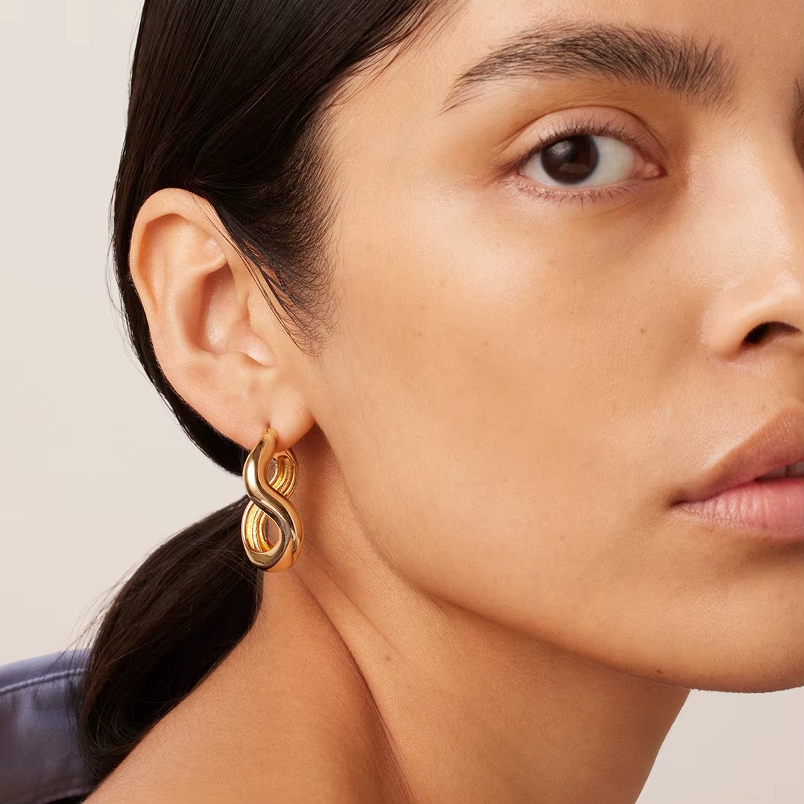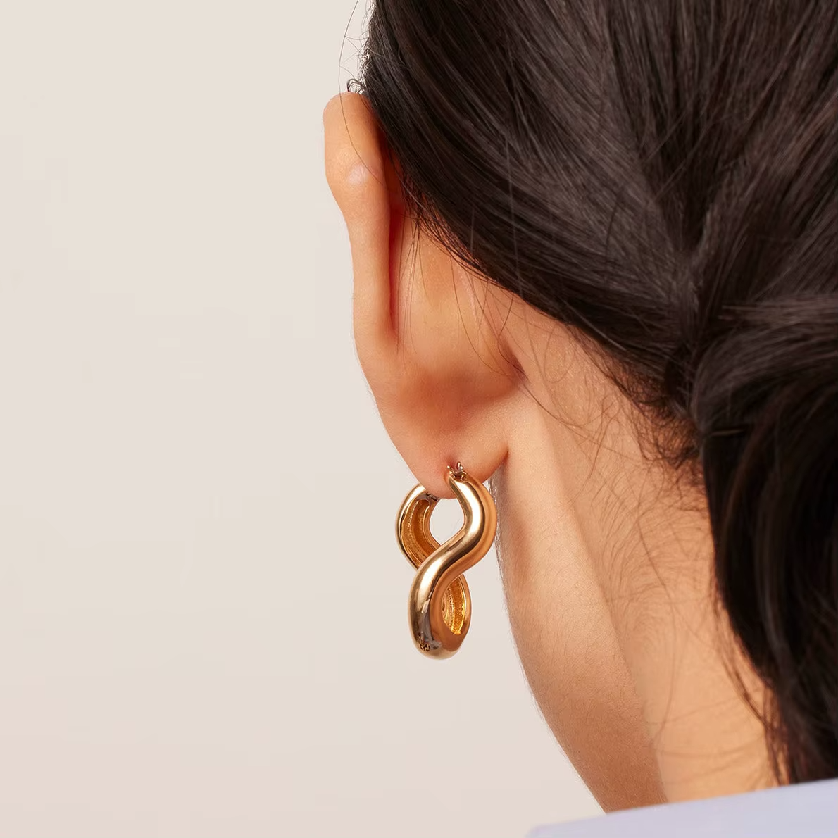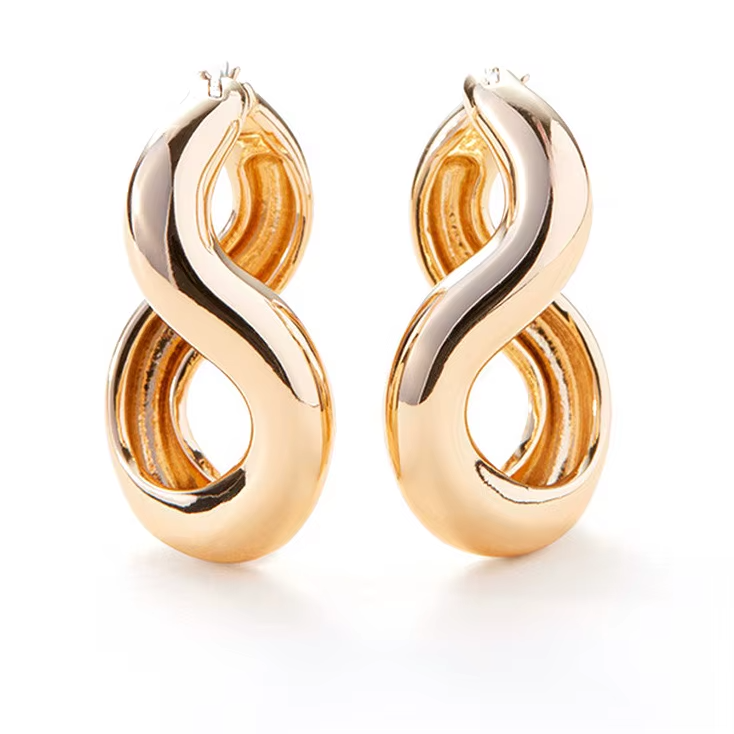 These 2024 modern-style chunky infinite hoops feature a unique double twisted design in polished brass. Perfect for gala events or elevating everyday fashion. The thick hoop silhouette makes a bold statement, offering a stylish and contemporary look for fashion-forward women. Ideal for party wear, weddings, or luxury casual ensembles.