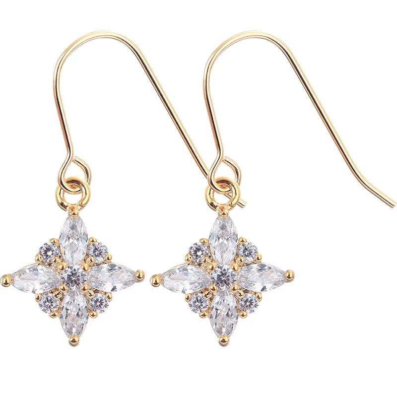 Delicate 14K gold-plated zircon earrings with floral sparkle. Lightweight, secure hook design, perfect for elegant office and party wear.