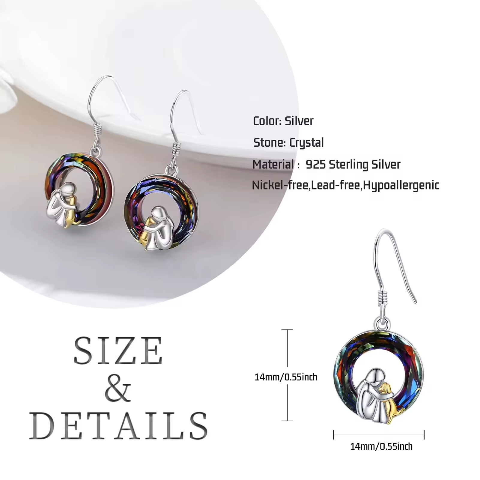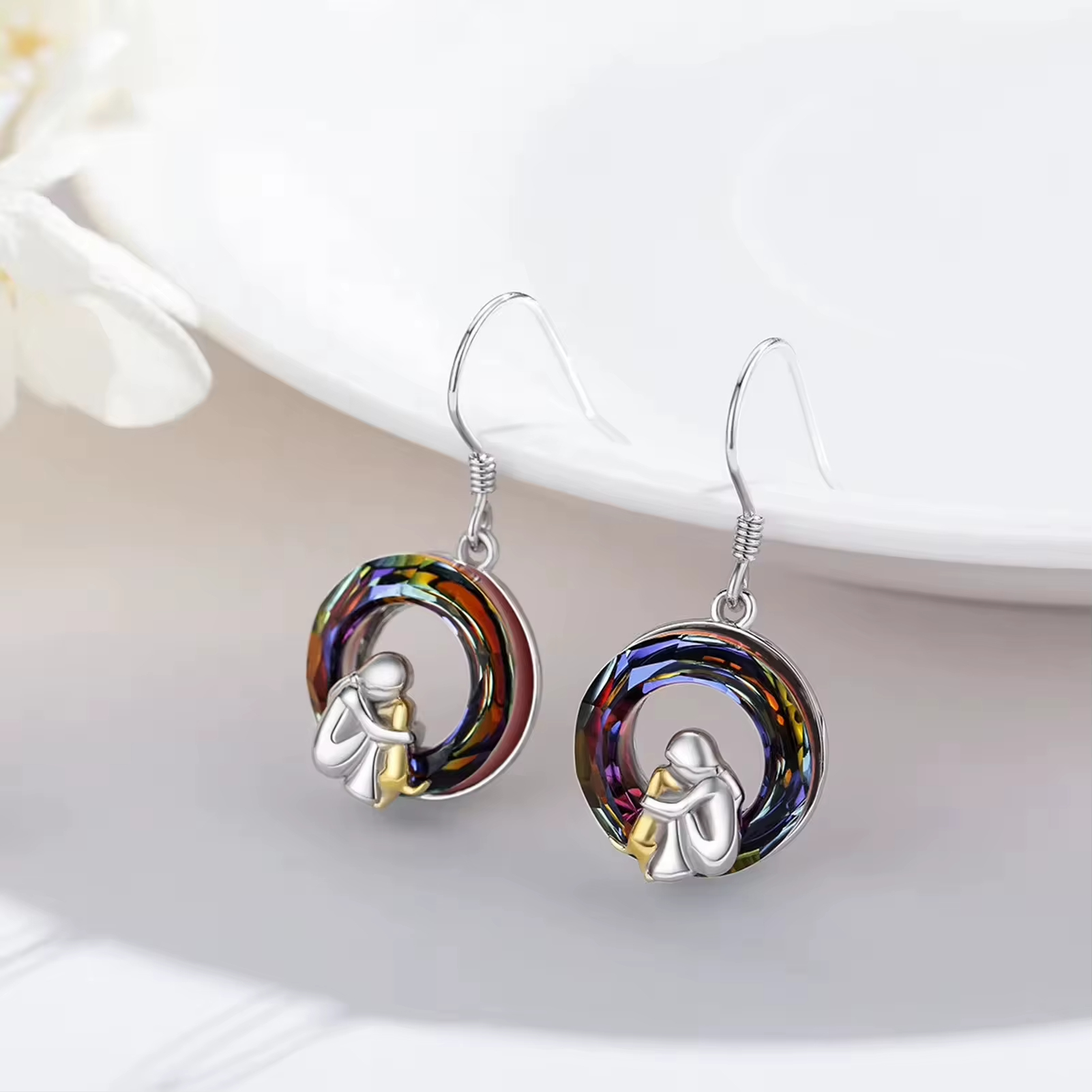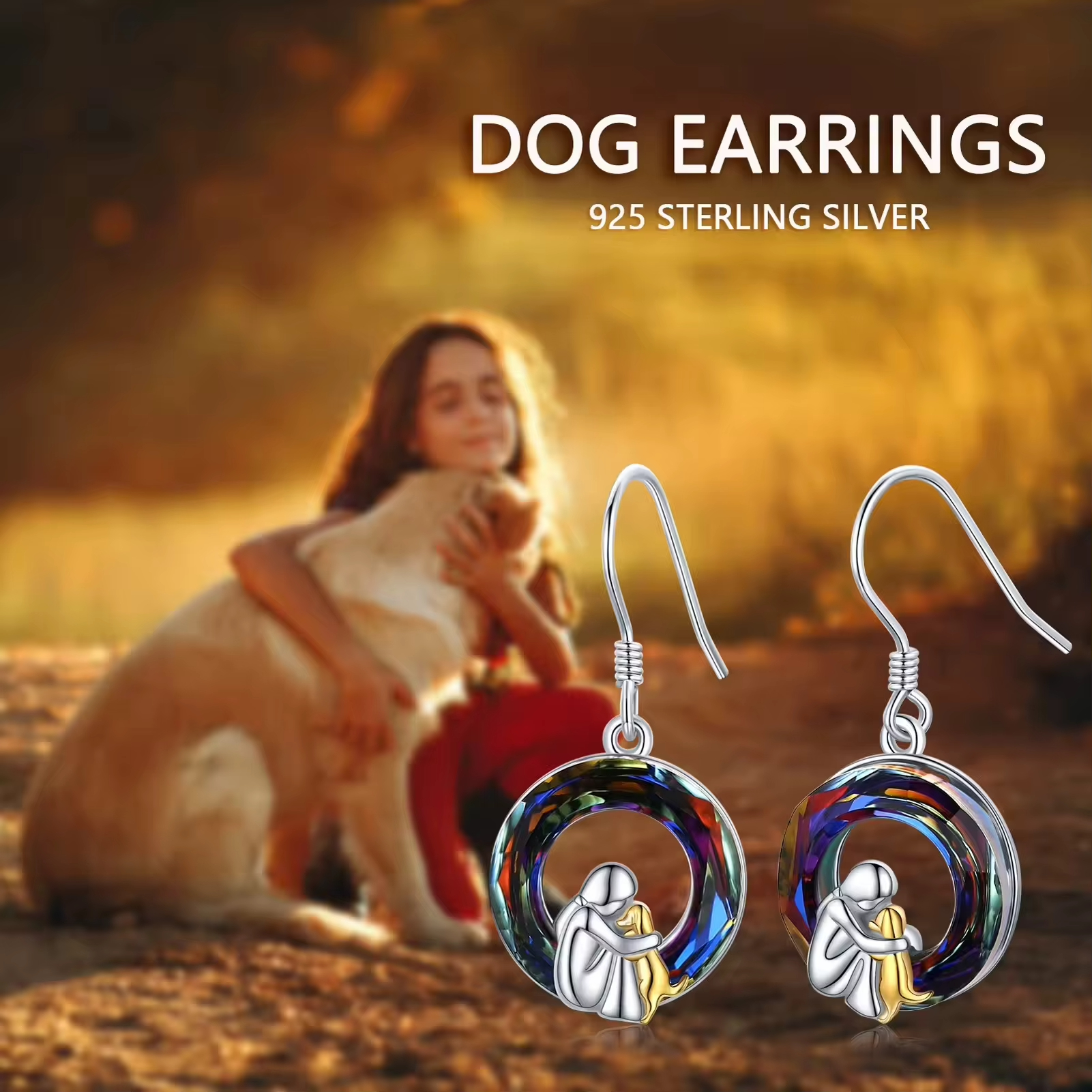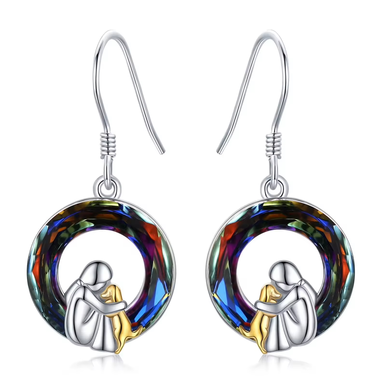 Design: Girl hugging dog motif inside multicolor crystal circle
