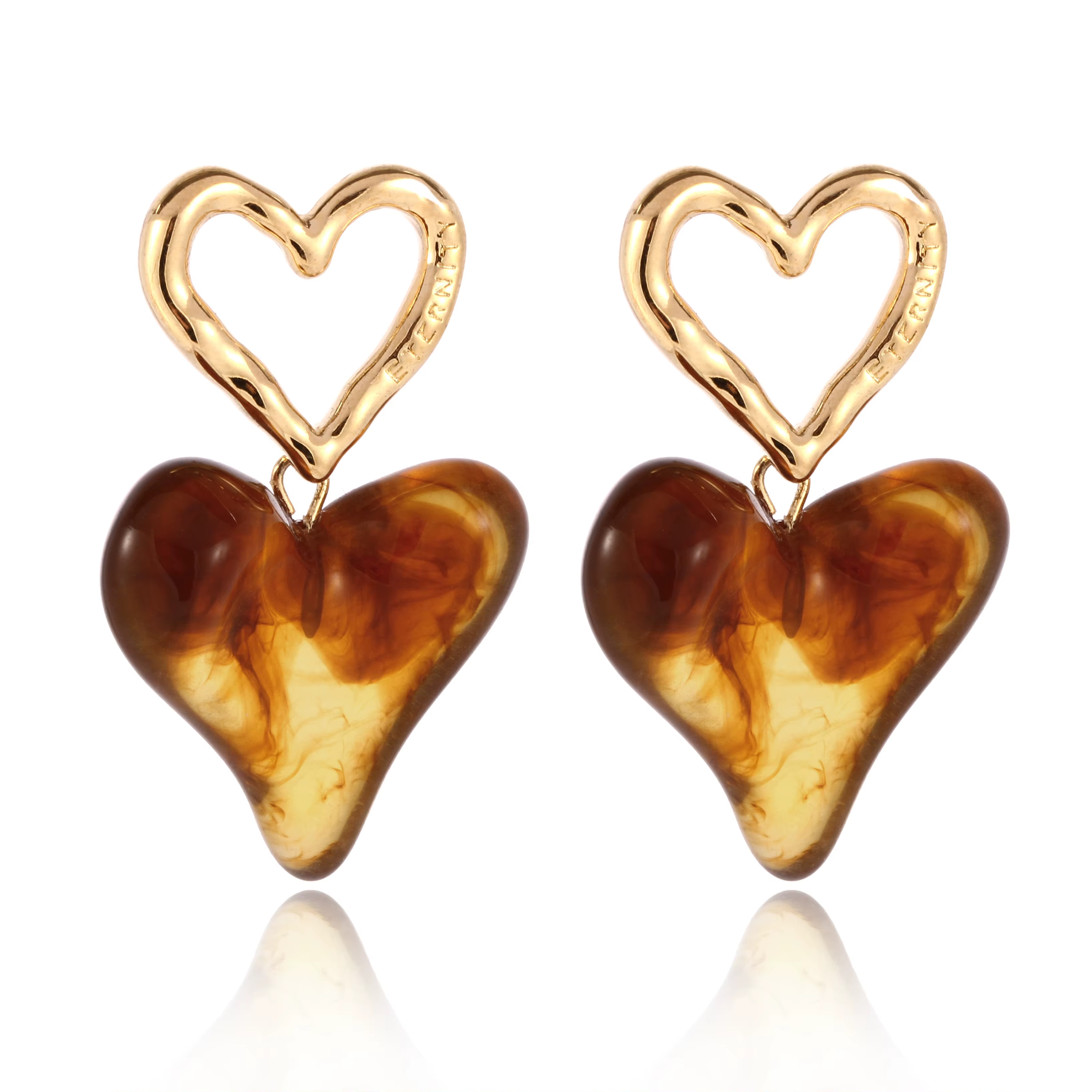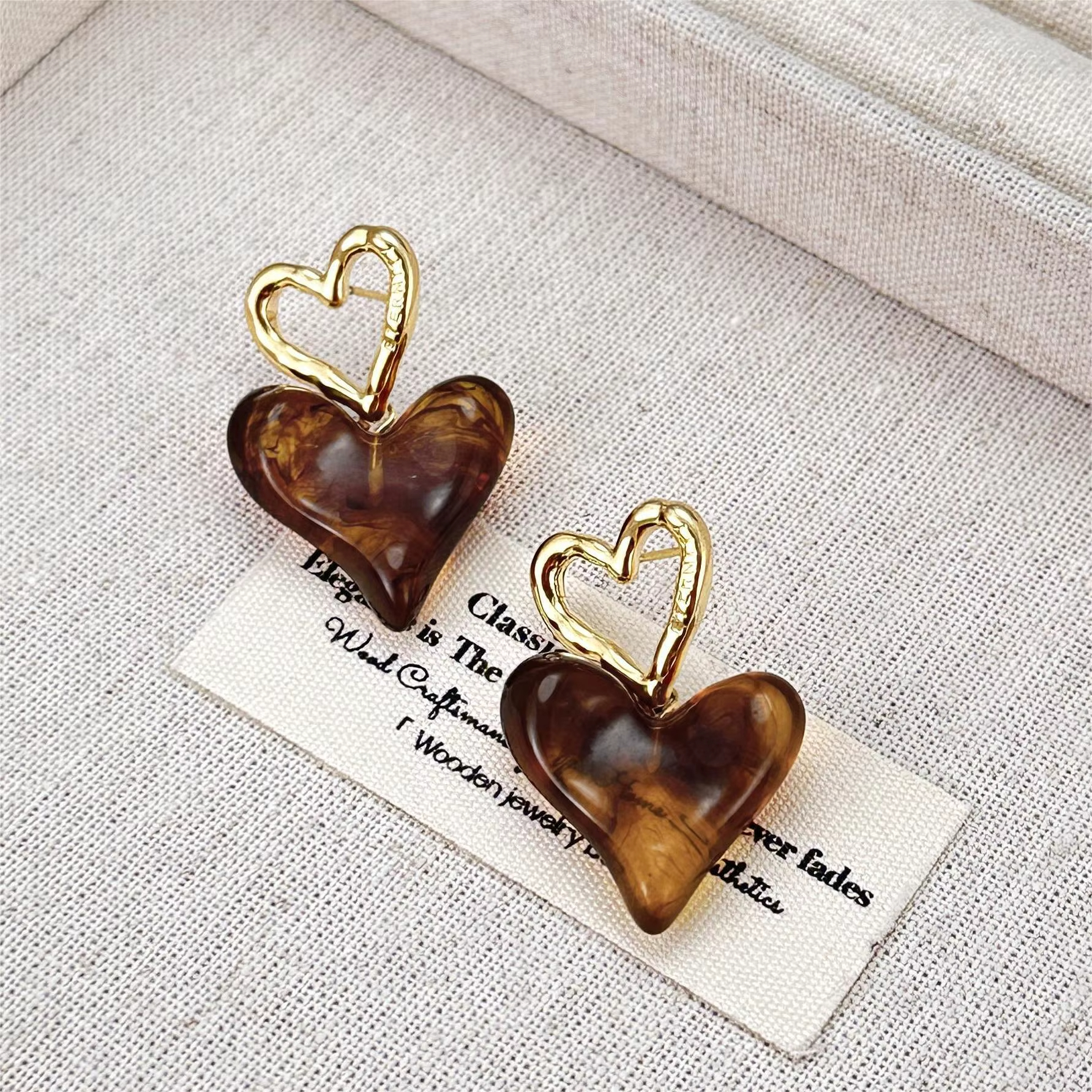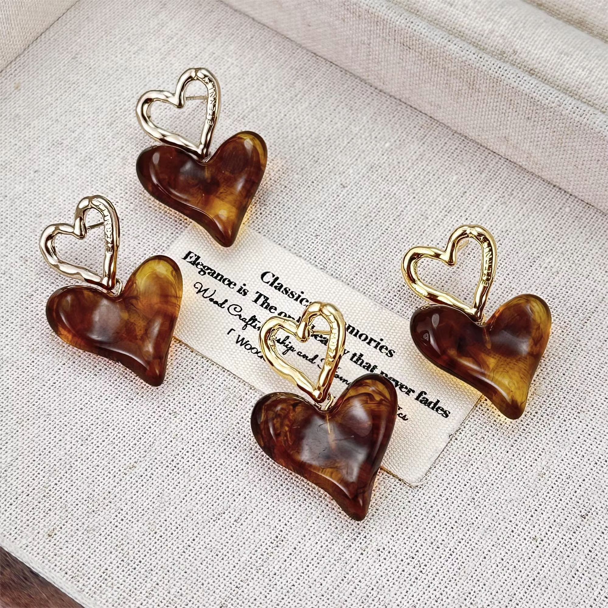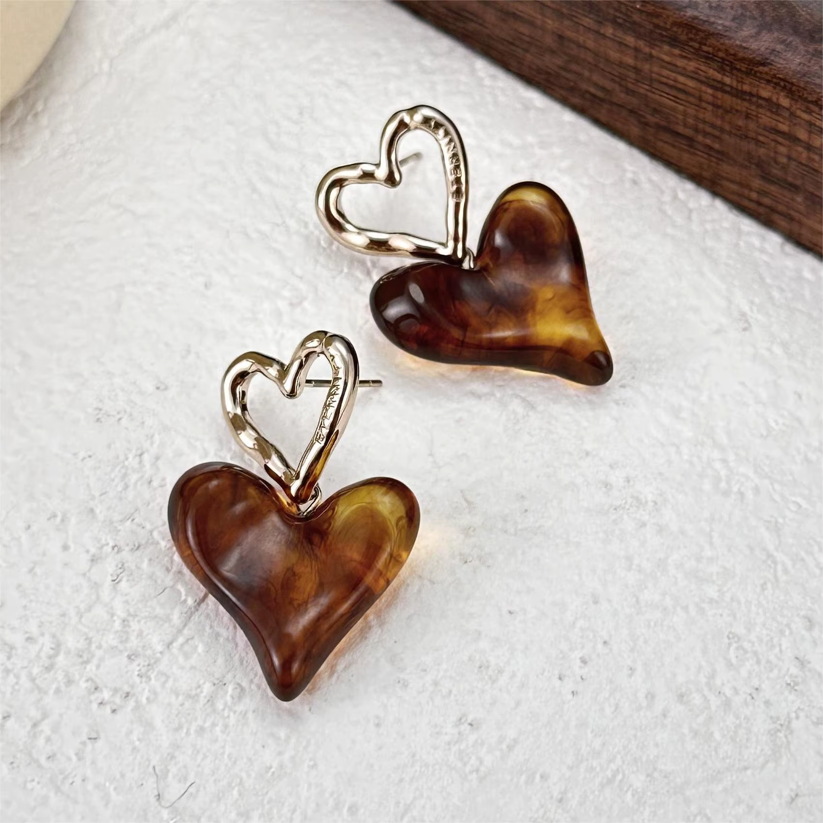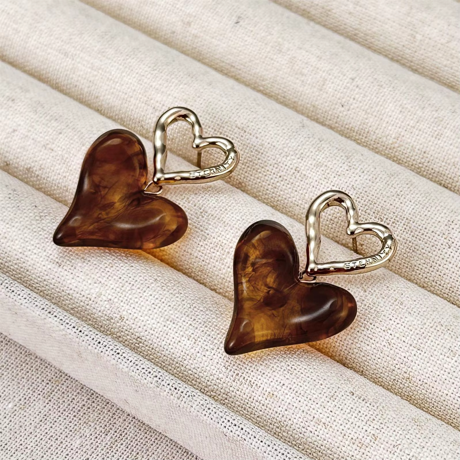 Design: Open heart top with abstract coffee-colored resin heart drop