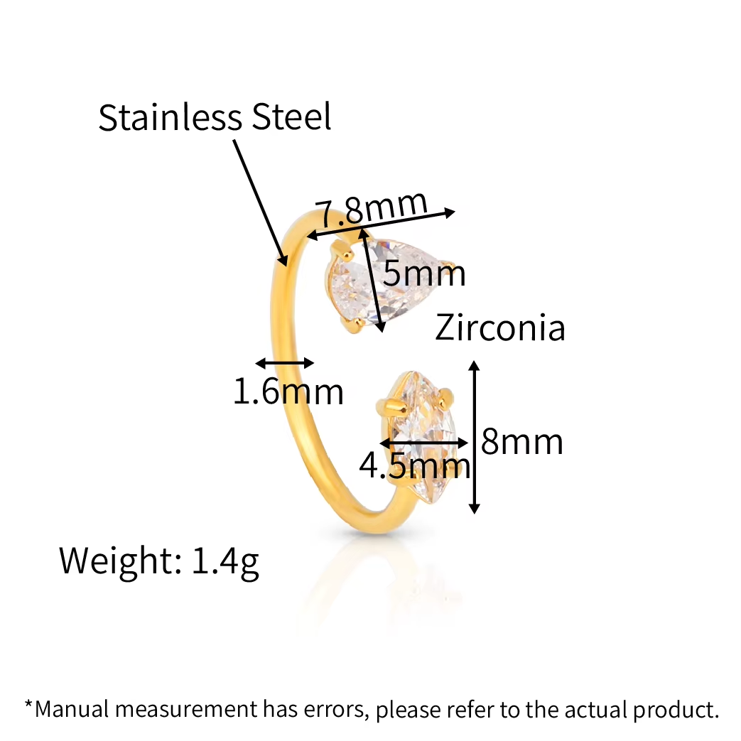 This modern open ring blends bold geometry with subtle sparkle. With pear and marquise cut zirconia on a sleek gold-plated band, it’s ideal for engagements or to elevate daily outfits.